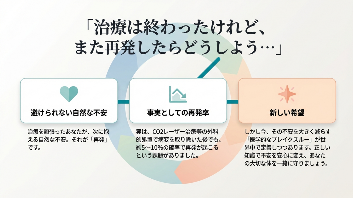 レーザー治療を頑張って受けようと考えているけど、「また再発してしまったらどうしよう…」と不安な気持ちを抱えていませんか❓