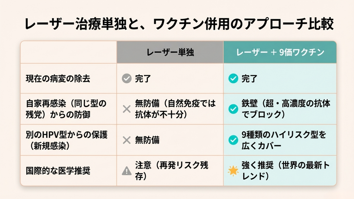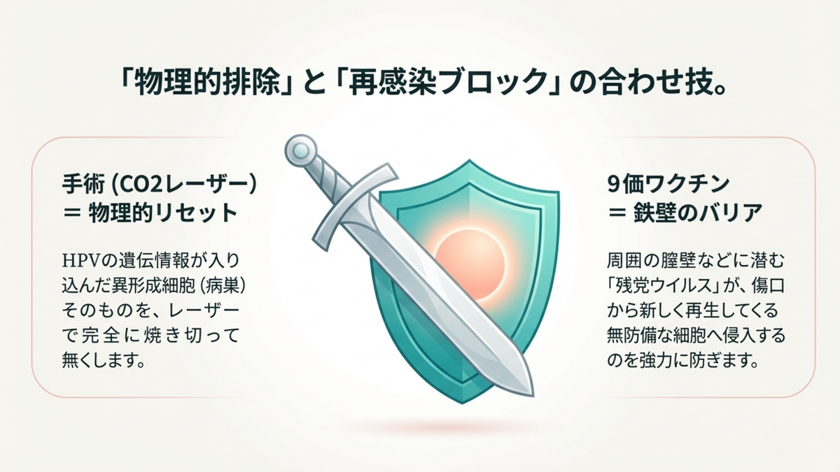では、なぜ治療後のワクチンが「既往感染の型」による再発を防げるのでしょうか?それは、「手術(物理的排除)」と「ワクチン(再感染ブロック)」の役割分担(合わせ技)が機能しているからです。