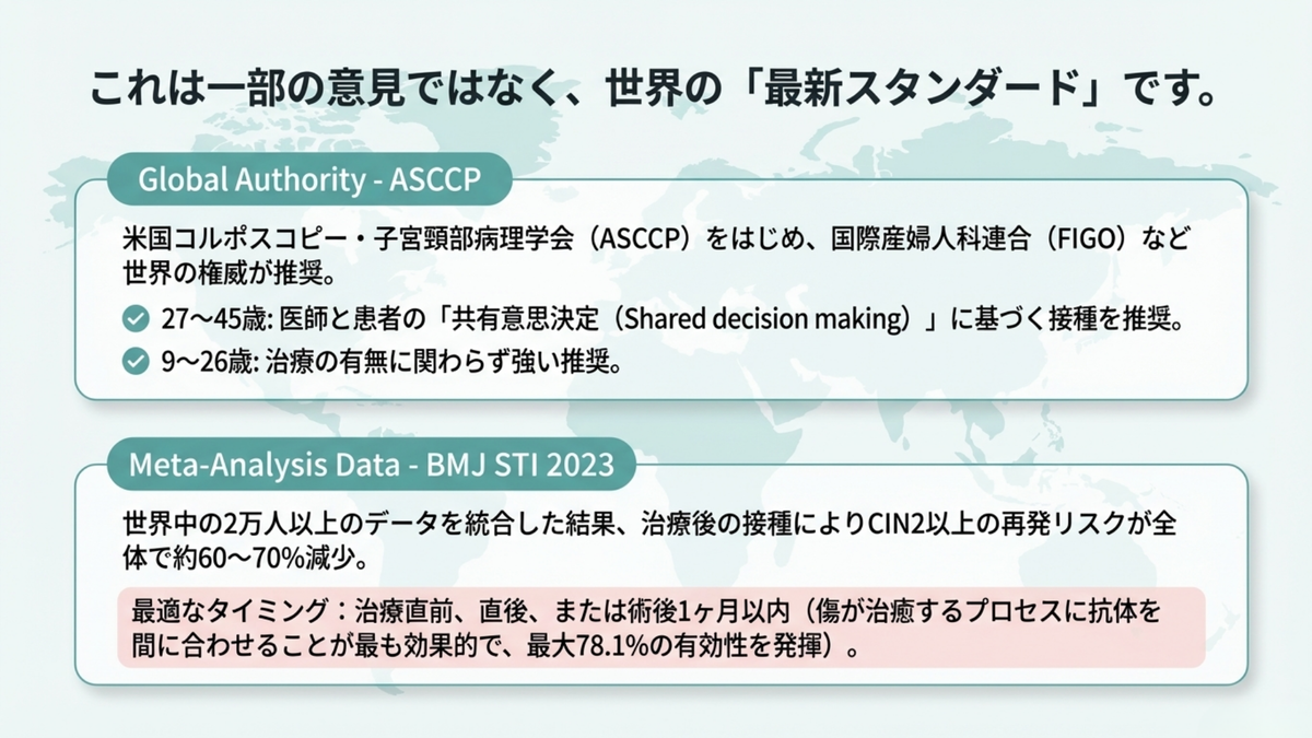 世界的に権威のあるASCCP(米国コルポスコピー・子宮頸部病理学会)やFIGO(国際産婦人科連合)は、治療後の補助的接種を推奨しています。