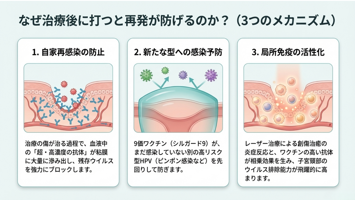 1️⃣ 自家再感染(オートイノキュレーション)の防止: レーザーで病変を取り除いても、正常に見える周りの組織や腟壁には残党ウイルスが潜伏しています。手術後の創傷治癒過程の細胞にこれらが入り込むことが再発の主因ですが、ワクチンによる高濃度の抗体がこれを強力にブロックします。