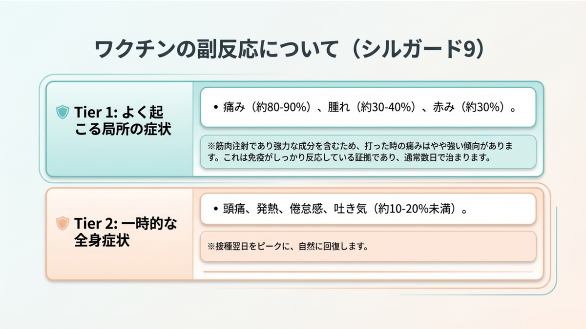 ⚠️全身症状: 頭痛、発熱、倦怠感、吐き気(10〜20%未満)。