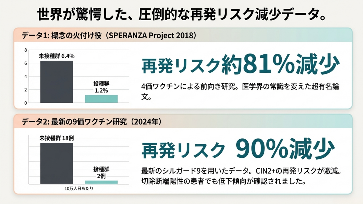 従来、HPVワクチンは「感染前に接種するもの」という認識が一般的でしたが、近年の大規模な臨床研究およびメタ解析により、治療後の接種が病変の再発リスクを60〜90%劇的に減少させることが明らかになりました。