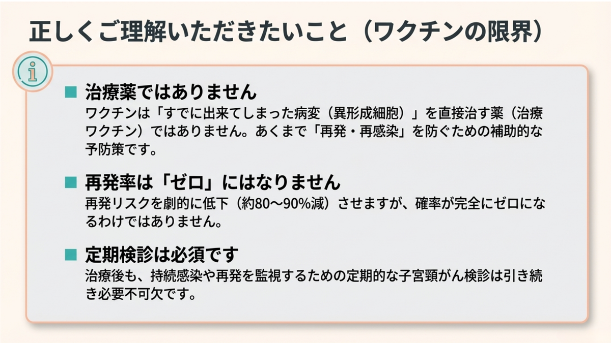 ✅治療的効果の否定: 予防ワクチンは既存のHPV感染細胞や現在の病変を直接治療(治癒)するものではないこと。